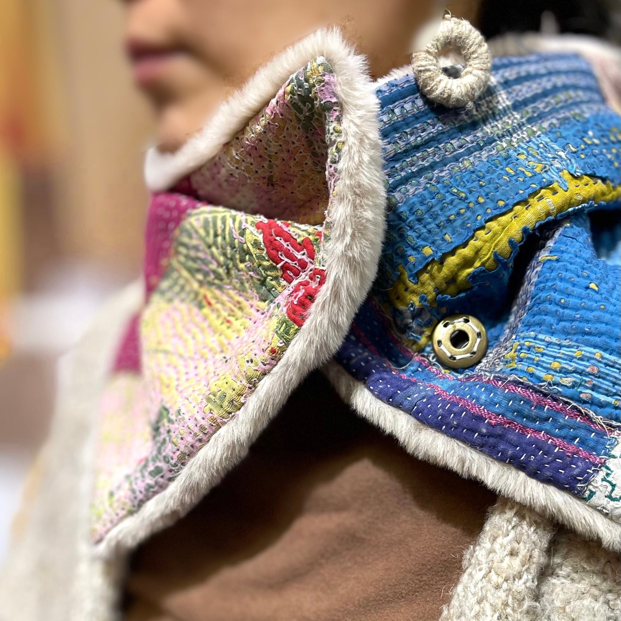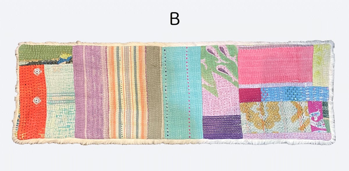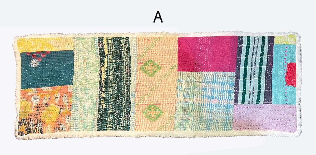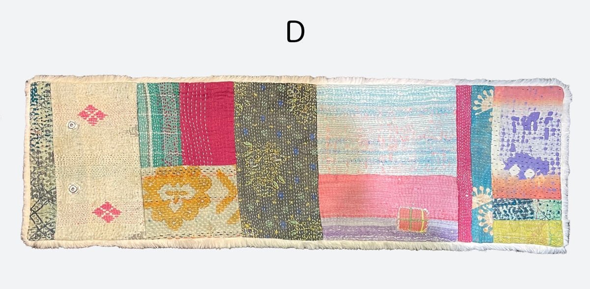 *カンタキルト(ラリーキルトとも言います)は、古くなったサリーやハギレなどをパッチワークし、ひと刺しひと刺し手で刺し施したテキスタイル。インド・パキスタン・バングラデシュなどの中央アジアで長い間受け継がれてきた伝統工芸品です。